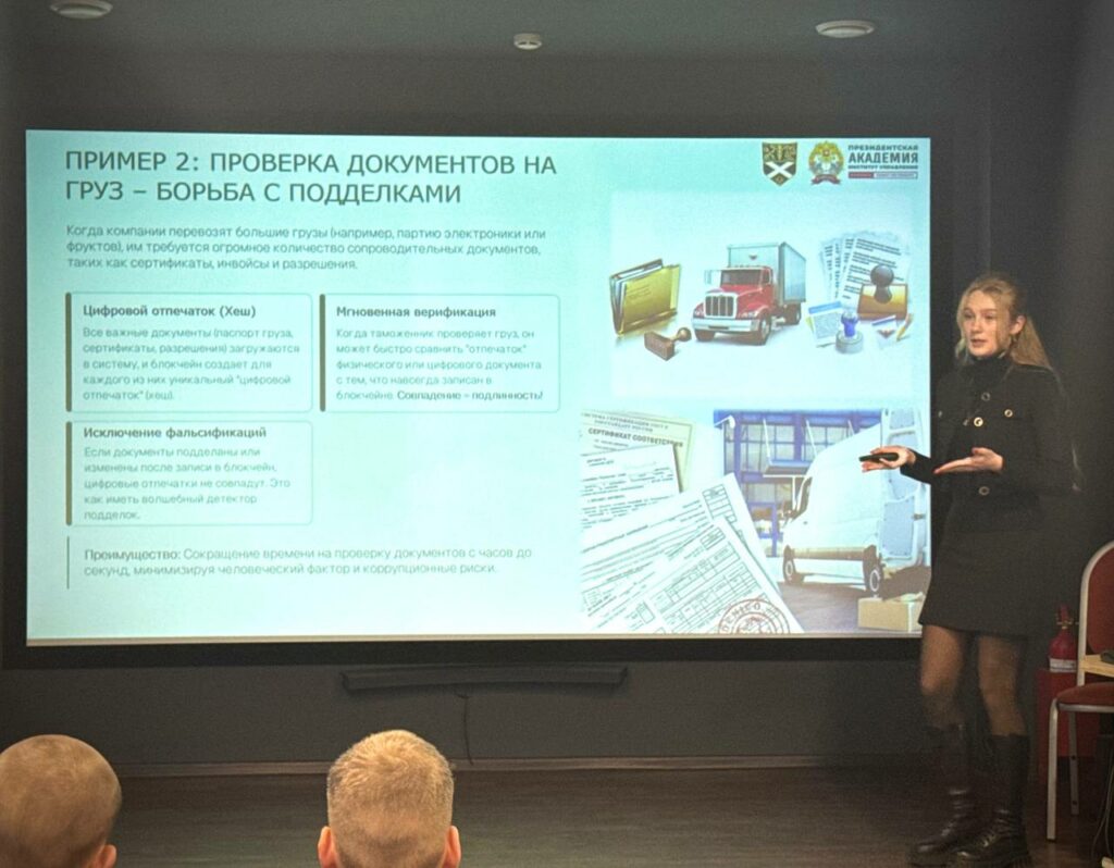 Мероприятие было посвящено популяризации науки в форме научного стендапа. Студенты рассказали о том, что таможня — не только отчетность и формальности. За строгим образом профессии скрываются умные технологии, точные приборы и четвероногие напарники. Студенты простыми словами объясняли сложные вещи: как служебные собаки помогают в работе, какое новейшее оборудование ловит нарушителей, что такое блокчейн и зачем он нужен в таможенной деятельности.