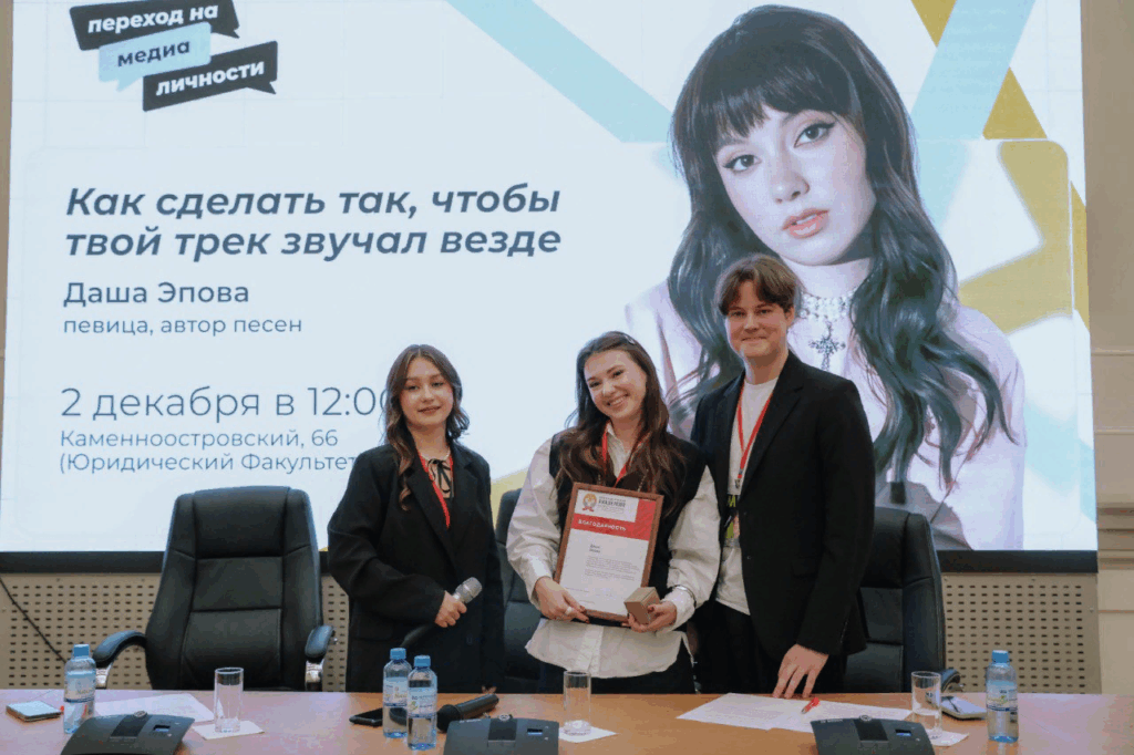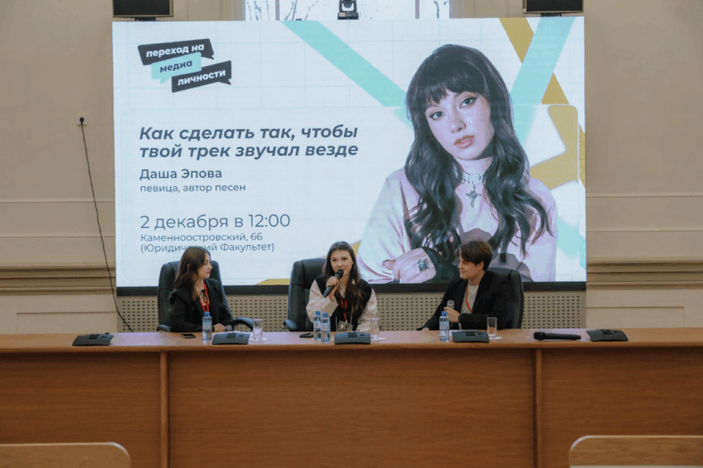 На площадке Президентской академии в Санкт-Петербурге в рамках проекта «Переход на МедиаЛичности» состоялась творческая встреча студентов с певицей и музыкантом Дашей Эповой. Автор хитов «Останься» и «Летний вечер» рассказала о том, как продвигать музыку в современном медиапространстве, оставаться верным своему стилю и находить вдохновение в личном опыте.