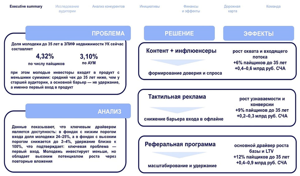 Команде петербургского кампуса Президентской академии достался кейс от «Современного Фонда Недвижимости». Перед студентками стояла амбициозная задача: разработать стратегию увеличения доли молодежи (до 35 лет) среди пайщиков закрытых паевых инвестиционных фондов недвижимости с 3% до 10% за три года.