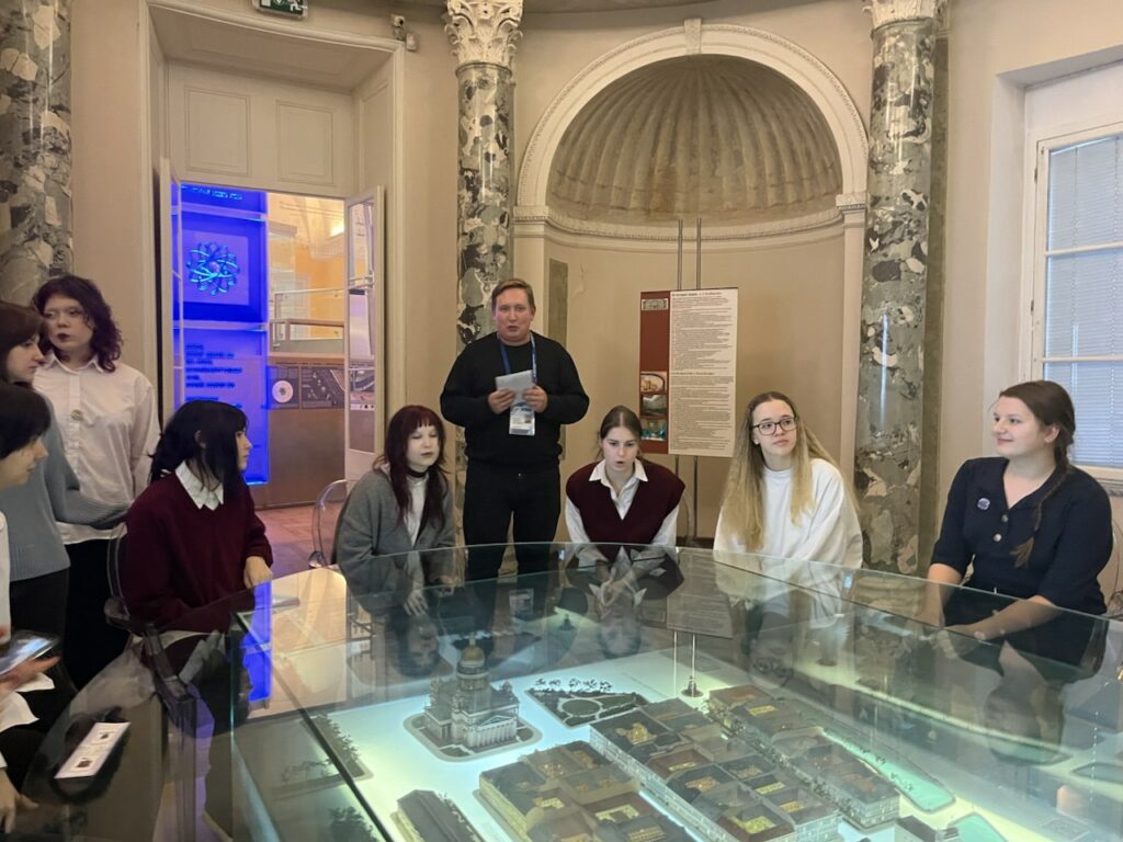 Экскурсия была организована под кураторством старшего преподавателя кафедры УСТиГБ и руководителя образовательной программы «Гостиничное дело» Дмитрия Бурлова. Проведя студентов по технологическому периметру подготовки форума, руководитель сектора технического сопровождения специальных проектов отдела развития и продаж услуг площадки ООО «ЭФ-Интернэшнл» Максим Етчо предоставил уникальный шанс увидеть «закулисье» создания масштабного события — от этапов брендирования пространства до финишной приемки стендов подрядчиков.